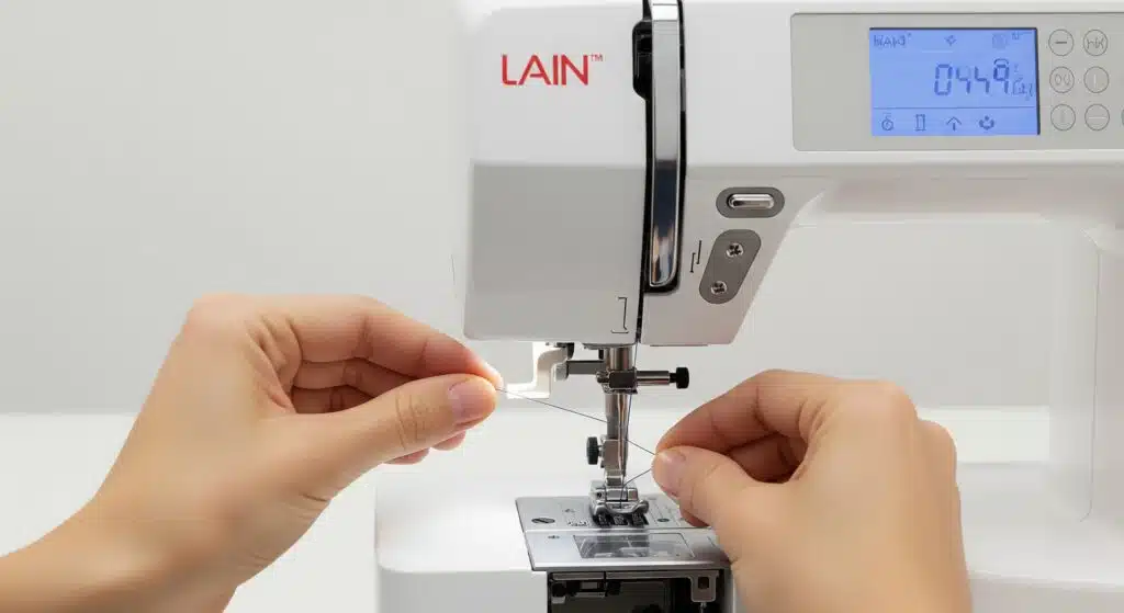 - השחלה באזור המחט: כולל מעבר דרך מובילי חוט קטנים עד להשחלה דרך עין המחט עצמה – מהחזית לאחור (במכונות ביתיות רגילות).